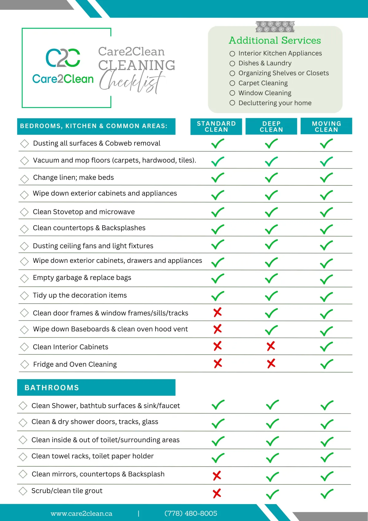 Residential Cleaning Checklist ensures that no detail is overlooked. From kitchens to bedrooms, bathrooms to living areas, this professional guide covers every corner of your home, providing a step by step breakdown to achieve a spotless, healthy, and welcoming environment according of the service you chose.
